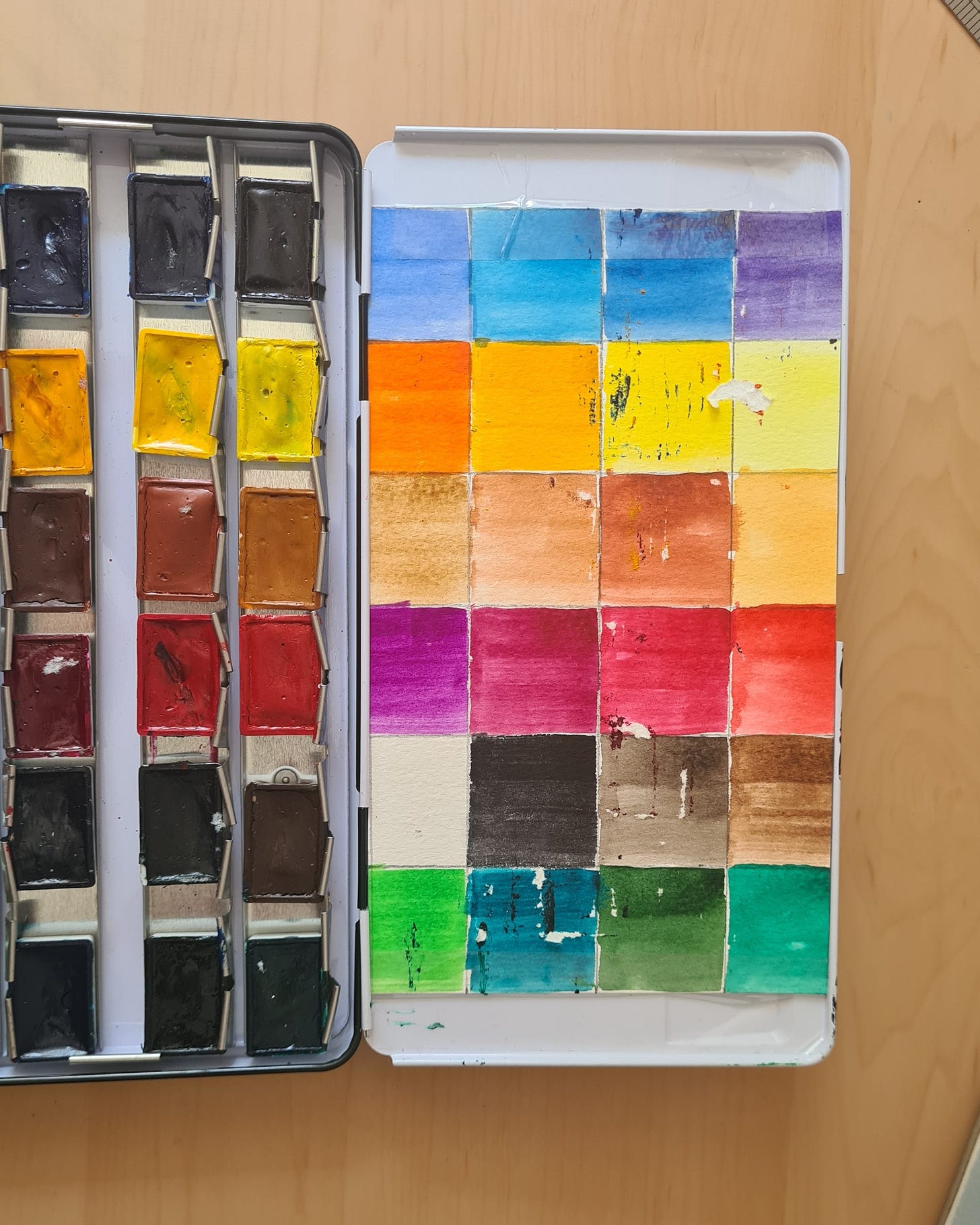 Even learning how to use another software or a new painting medium requires practice before tackling that big job. When I did my first watercolour painting, I did swatches of every pan, so I know what they look like on paper (please don’t look at how mistreated the paint pans are).